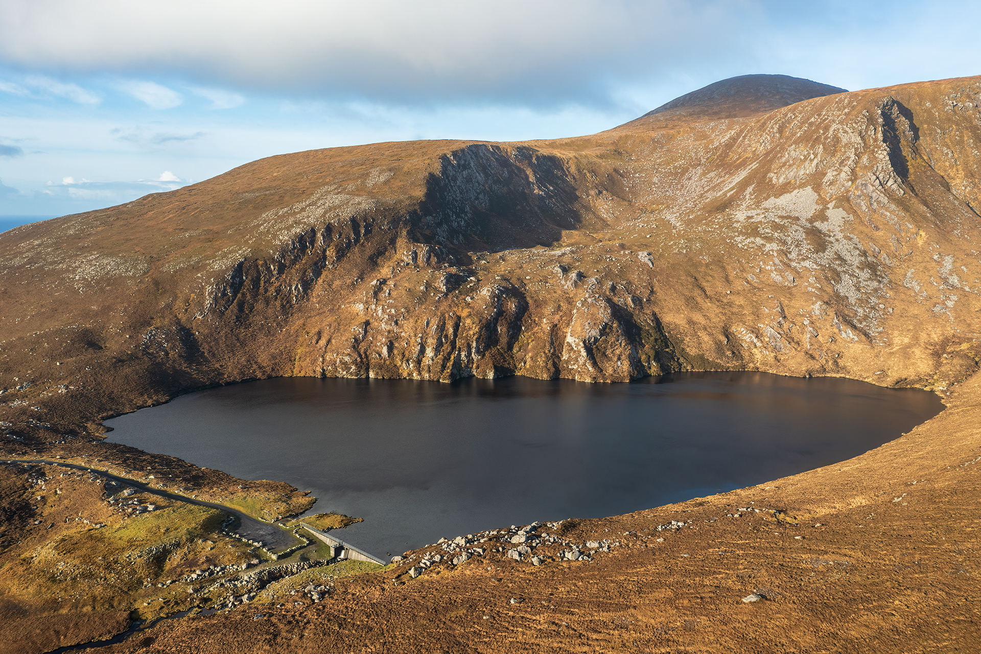 In this captivating aerial photograph by an Irish landscape photographer, Corrymore Lake on Achill Island in County Mayo, Ireland, emerges as a spellbinding setting steeped in cinematic mystique. Serving as a prominent film location for “The Banshees of Inisherin,” the lake exudes an otherworldly aura from above.