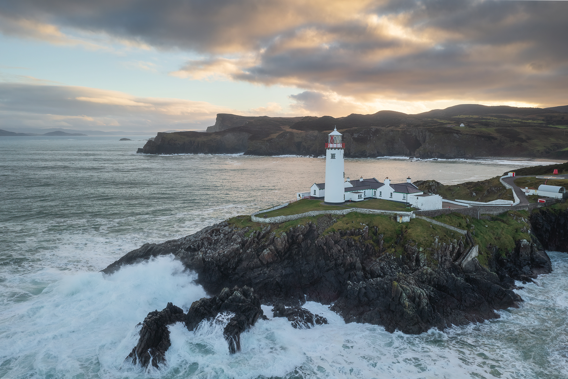 This breathtaking aerial photograph captures the iconic Fanad Lighthouse in County Donegal, bathed in the golden hues of an Irish sunset. Taken by a skilled Irish landscape photographer, the image showcases the rugged beauty of Ireland’s northern coastline from a unique vantage point.