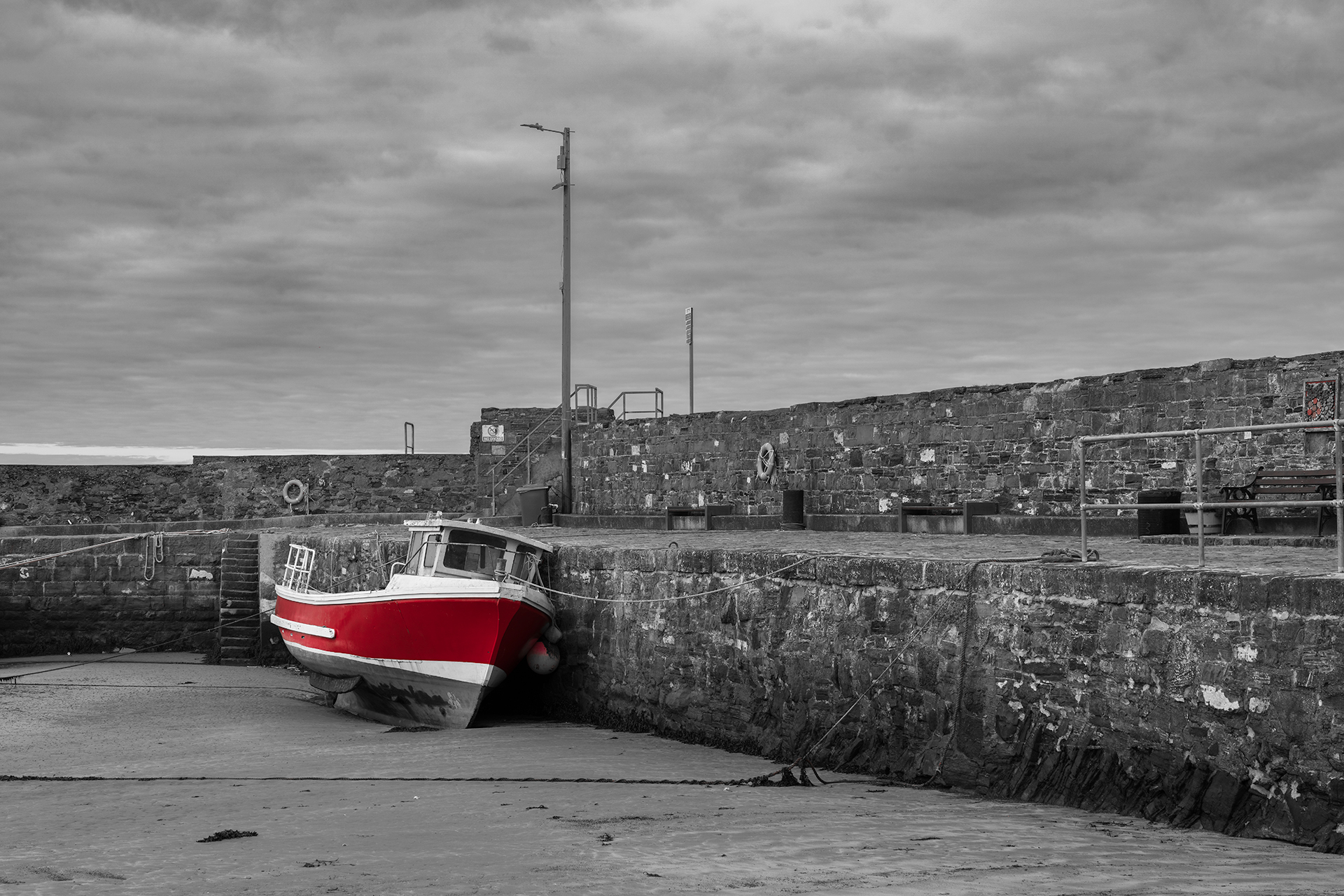 The selective red colour highlights specific elements of the, boats markings, creating a striking contrast against the monochrome backdrop. The stillness of the tide-out scene conveys a quiet, almost timeless atmosphere.